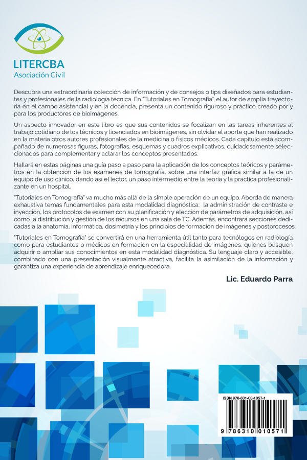 En «Tutoriales en Tomografía»: entre la teoría y la práctica, el autor presenta un contenido riguroso y práctico creado por y para los productores de bioimágenes y médicos en formación en la especialidad de imágenes. Un aspecto innovador en este libro es que sus contenidos se focalizan en las tareas inherentes al trabajo cotidiano de los técnicos y licenciados en bioimágenes.